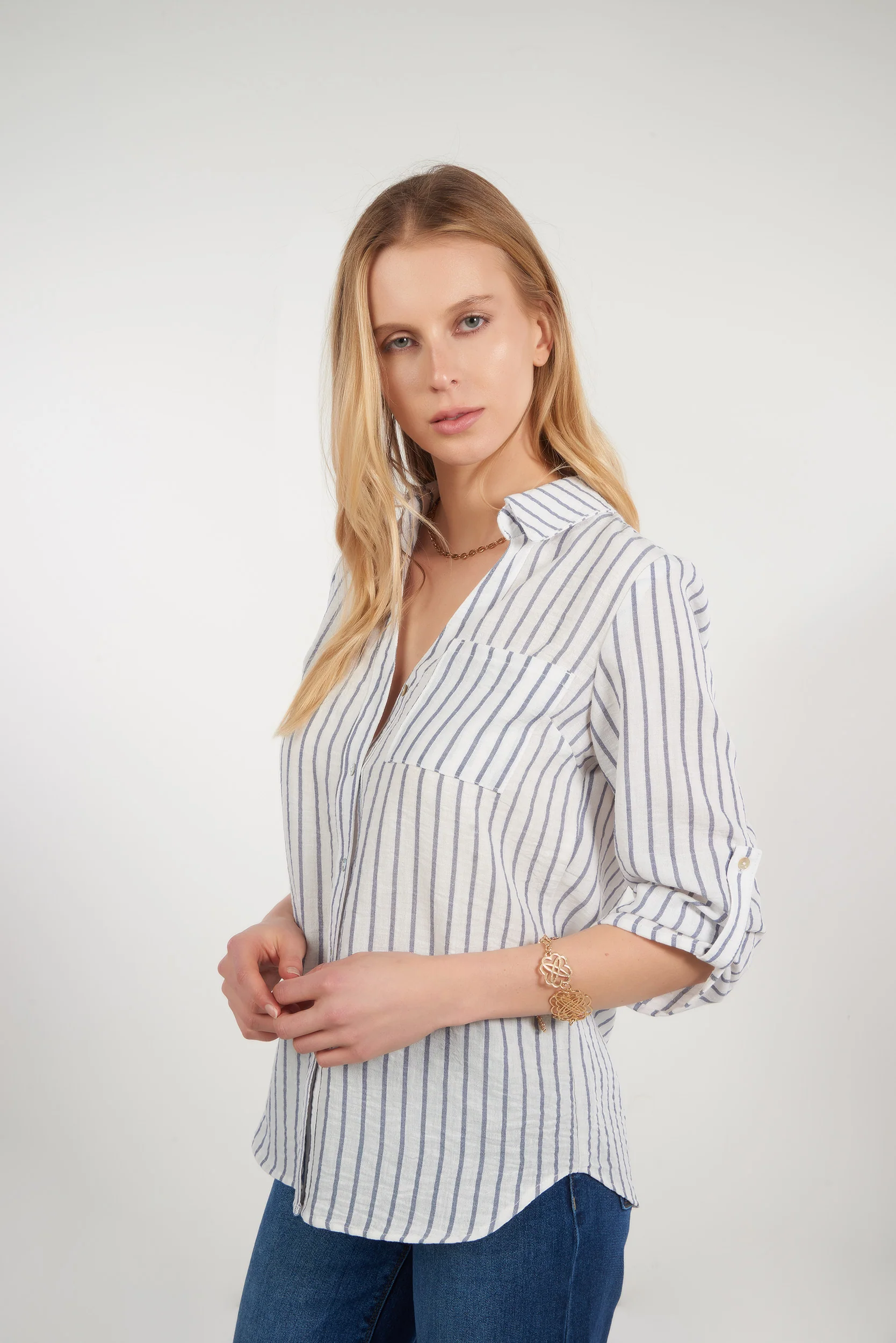 Magasinez nos blouses pour femme, la chemise pour femme Pinga-3. Avec ses rayures, cette blouse vous est offerte en 2 choix : blouse blanche et beige et blouse blanche et bleue.