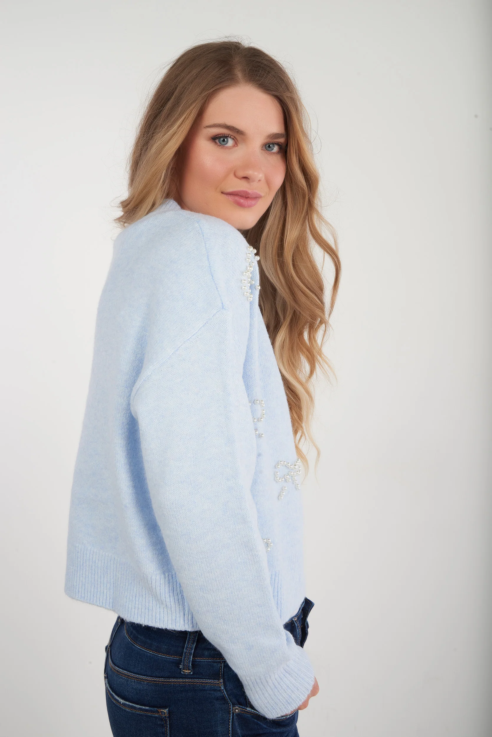 Restez au chaud avec nos chandails pour femme de style sweater, dont le modèle BOW. Orné de boucles en perles, ce chandail allie confort et élégance pour du style assuré lors des journées plus fraîches. Offert en trois couleurs: bleu, lilas et rose.