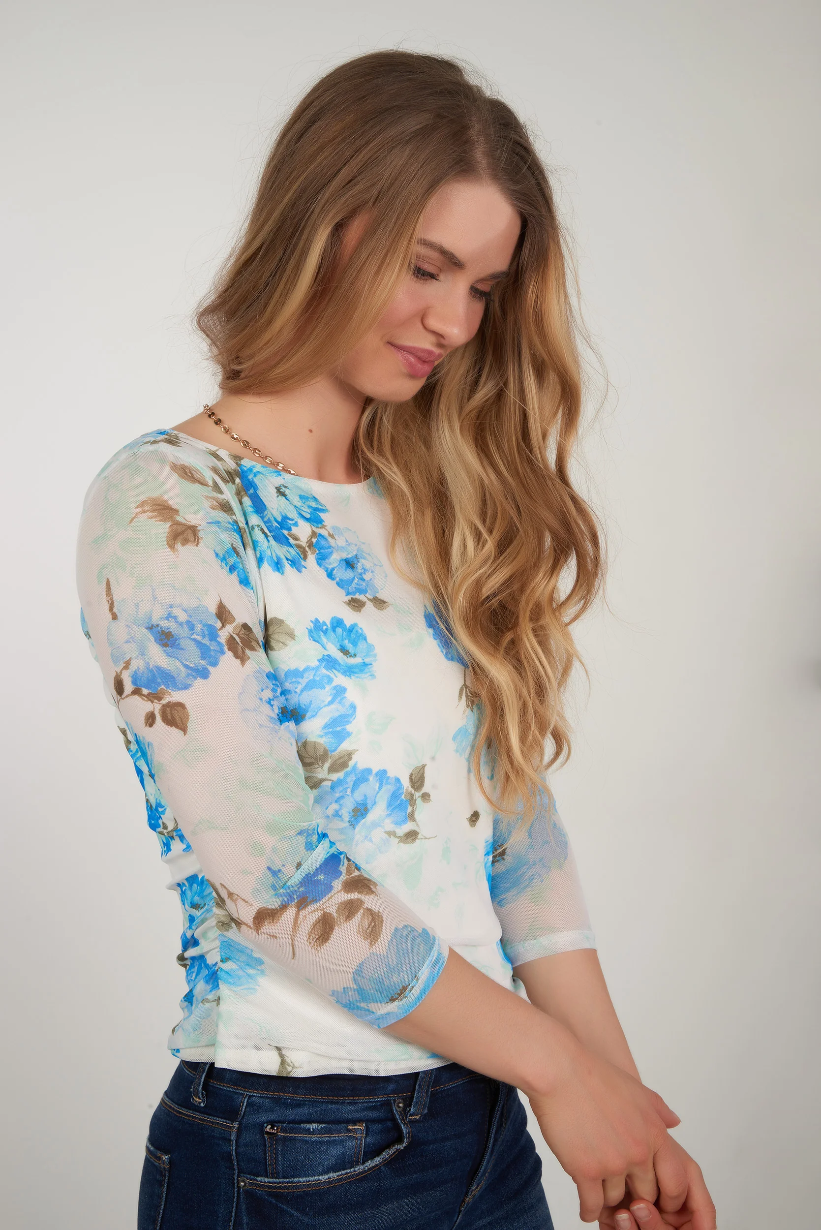 Haut en filet fleuri à manches trois-quarts - KOMAL-MESH - (R-A4)